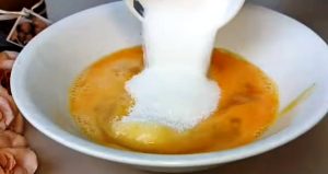 Mettre 400 ml de lait sur le feu et le faire chauffer. Battre les œufs avec le lait et le sucre au batteur.